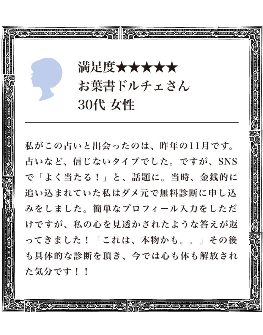 | 特徴 | 驚きの声が沢山 占い初心者も経験者 も満足度が高い |