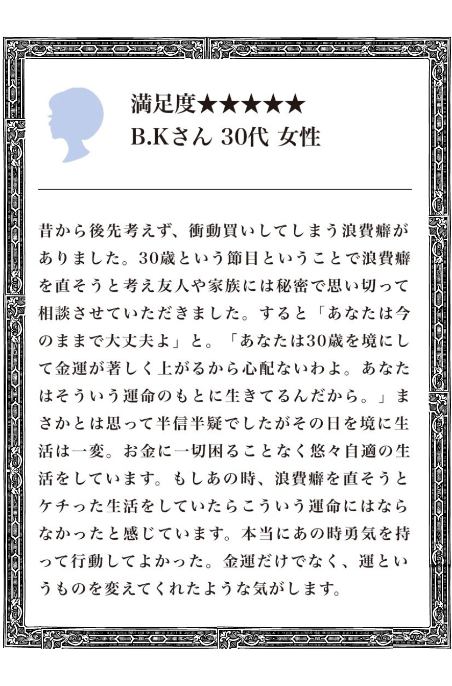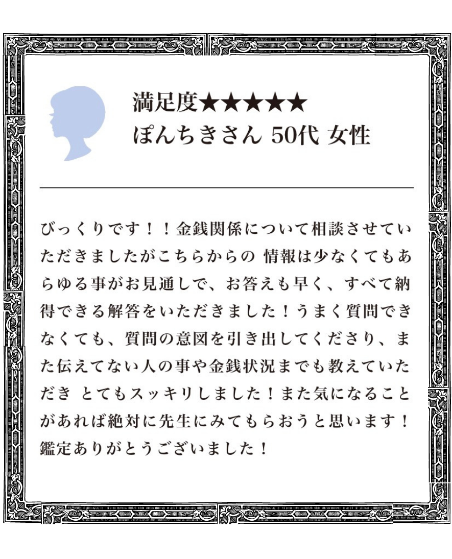 - 個人的な恋愛・人間関係の深い鑑定結果が役立つと評判!いままでの生い立ちや現状から、これから訪れるバイオリズムに合わせて行う行動の助言をもらえると話題に!